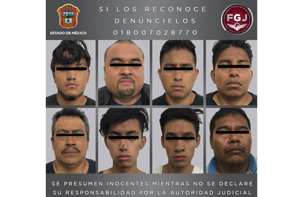 Los detenidos fueron identificados como Eliseo “N” de 47 años de edad; Jordi “N”, de 23 años; Roberto Carlos “N”, de 28 años; Fabián “N”, de 20 años; Marco Antonio “N”, de 24 años; Pablo “N”, de 44 años; Francisco Javier “N”, de 21 años, y David Ángel “N”, de 38 años.
