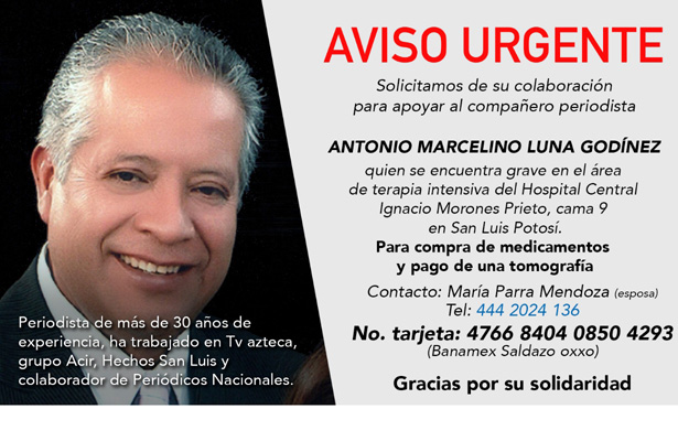 SAN LUIS POTOS, SLP.- El gremio periodístico en la entidad no solo hace un llamado a todos los compañeros para apoyar económicamente a la familia de Antonio Marcelino Luna Godínez, sino también espera un milagro que le devuelva la salud.
