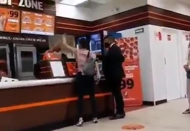 NAUCALPAN, EdoMéx.- A través de redes sociales, este fin de semana se difundió un video en el que una joven mujer se mete a una sucursal de Little Caesars, ubicado en este municipio, insulta a los empleados de mostrador, arroja lo que encuentra ahí, los amenaza con llamar a su novio para que vaya a rafaguearlos, sólo porque no la dejaban entrar sin cubrebocas.