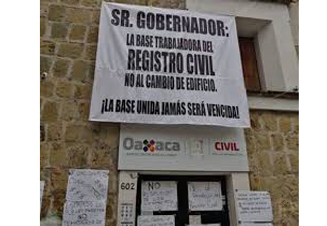 El pasado 6 de agosto, alrededor de 200 trabajadores se manifestaron frente a las instalaciones del Registro Civil de Oaxaca, en rechazo al cambio de instalaciones de esta dependencia de gobierno. Los inconformes dijeron que fueron informados que las oficinas serán trasladadas hacia la calle de Santos Degollado, ya que el inmueble que ocupan será utilizado para instalar un centro gastronómico, versión que no ha sido confirmada por la dependencia estatal.