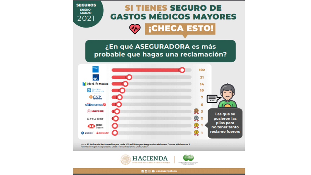 Lo anterior es de acuerdo con la Comisión Nacional para la Protección y Defensa de los Usuarios de Servicios Financieros (Condusef), la cual informó sobre la actualización del Buró de Entidades Financieras (BEF), del sector Aseguradoras, Ramo Gastos Médicos Mayores (GMM), correspondiente al periodo enero-marzo de 2021.