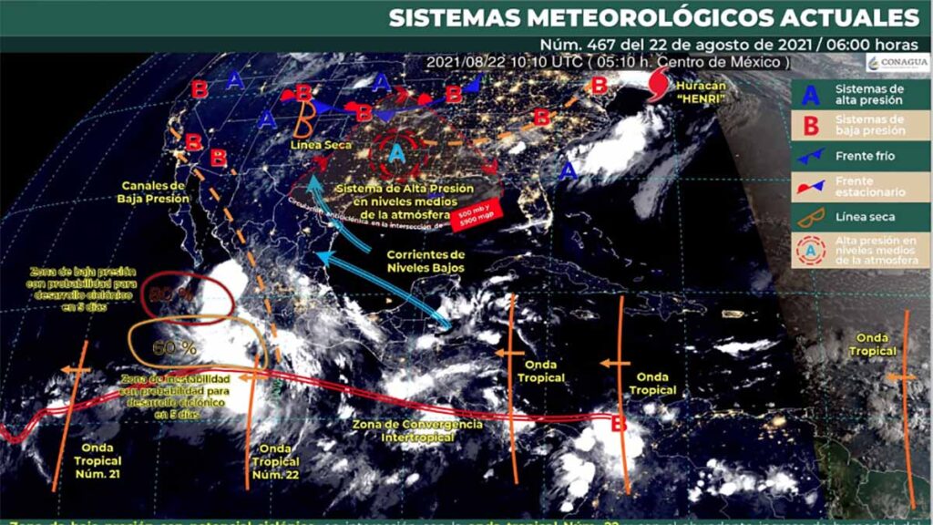 Este día, una zona de baja presión con alta probabilidad para desarrollo ciclónico frente a las costas de Jalisco, en interacción con la onda tropical Núm. 22 y el abundante ingreso de humedad del Océano Pacífico, originarán lluvias puntuales intensas en Sinaloa, Nayarit, Jalisco, Colima, Michoacán y Guerrero, lluvias muy fuertes en Puebla, Veracruz, Oaxaca, Tabasco y Chiapas, así como rachas de viento de 60 a 80 km/h y oleaje de 2 a 3 metros en costas de Nayarit, Jalisco, Colima y Michoacán. Por otra parte, un canal de baja presión sobre el y la aproximación de una nueva onda tropical (Núm. 23) a la Península de Yucatán, generarán lluvias fuertes a muy fuertes en regiones del sureste del país y la citada península. Otro canal de baja presión sobre el noroeste del país originará lluvias fuertes en dicha región además del norte del país. Adicionalmente, prevalecerán temperaturas de 40 a 45 °C en zonas de Baja California, Sonora y Sinaloa.