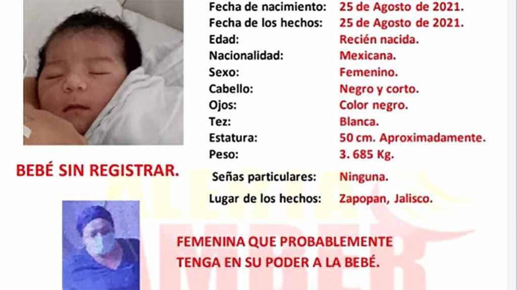 En el reporte de búsqueda se indica que la recien nacida es una femenida, de cabello corto negro, tez blanca, de unos 50 centímetros de grande, con un peso de tres kilos 685 gramos.