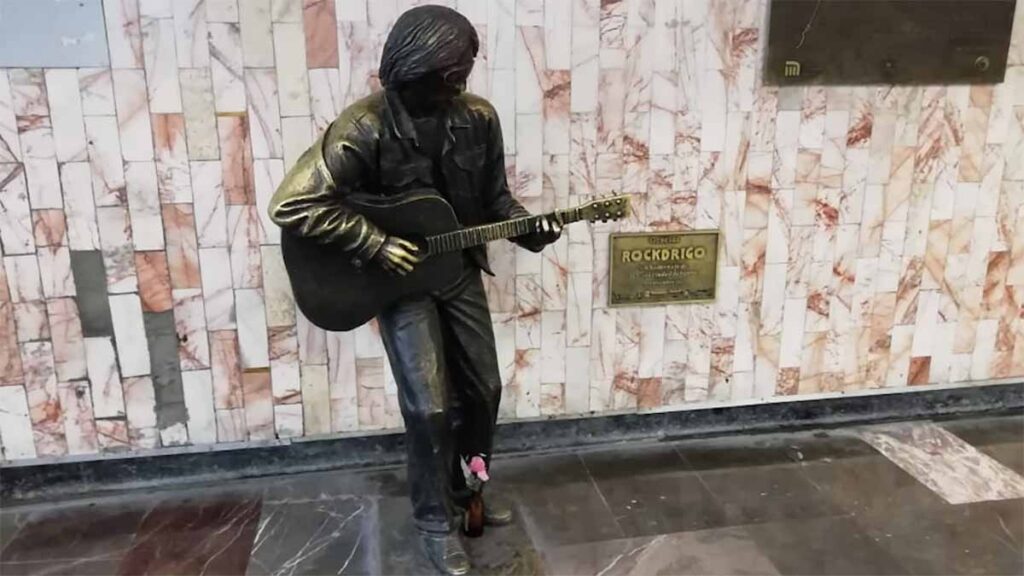 La escultura está dedicada al músico urbano Rodrigo Eduardo González Guzmán –mejor conocido como Rockdrigo. Falleció junto con su esposa durante el sismo del 19 de septiembre de 1985 en su departamento en la Colonia Juárez. Hace unos días, alguien colocó al pie de la efigie un sencillo adorno floral.