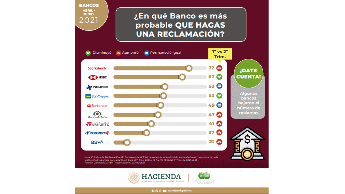 En el segundo trimestre de 2021, Scotiabank tuvo el mayor número de reclamaciones en México, seguido de HSBC, Inbursa y otras seis instituciones bancarias, reveló la Comisión Nacional para la Protección y Defensa de los Usuarios de Servicios Financieros (Condusef) al destacar: “Queremos que sepas cómo se comportan los bancos”.