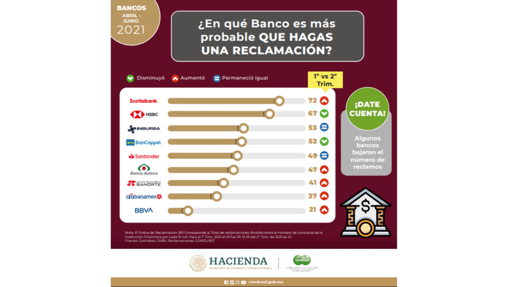 En el segundo trimestre de 2021, Scotiabank tuvo el mayor número de reclamaciones en México, seguido de HSBC, Inbursa y otras seis instituciones bancarias, reveló la Comisión Nacional para la Protección y Defensa de los Usuarios de Servicios Financieros (Condusef) al destacar: “Queremos que sepas cómo se comportan los bancos”.