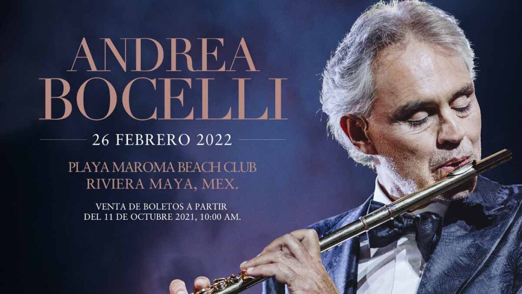 Global Pear Live Events y Music Vibe están ansiosos de compartir que Andrea Bocelli se presentará en nuestro país el sábado 26 de Febrero de 2022. Esta velada especial se llevará a cabo en Playa Maroma Beach Club, Riviera Maya, México. La venta de boletos saldrá a la venta a partir del 11 de Octubre, pero con una preventa especial este 7, 8, 9 y 10 de Octubre.