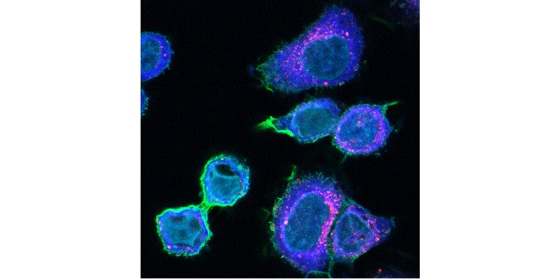 En la foto de portada: De uno de los experimentos de microscopia confocal donde se evalúa la incorporación de exosomas derivados de células resistentes a la doxorubicina en células sensibles a ella.