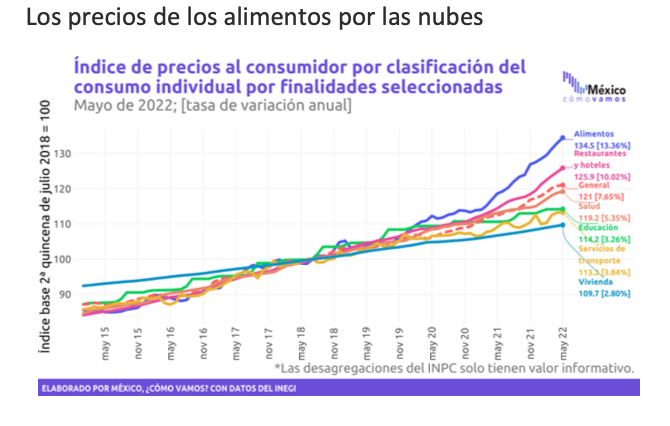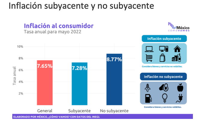 Señalan que, con base en los últimos datos publicados por el INEGI, México, ¿Cómo Vamos? estimó el semáforo nacional de inflación. De acuerdo con dichos datos, durante el quinto mes de 2022: