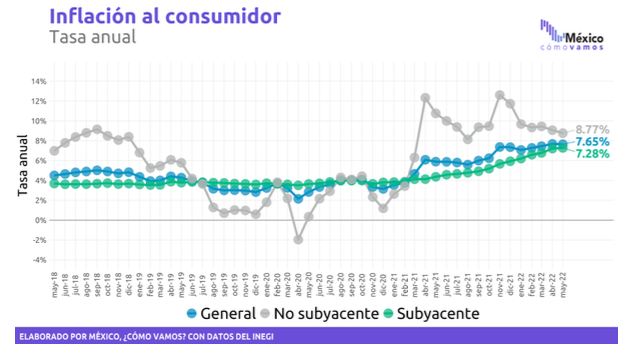 ● El dato de la inflación anual de mayo fue ligeramente mayor al consenso del mercado de 7.61% y fue menor a la registrada en abril de 2022, cuando fue de 7.68% anual. La inflación general y subyacente se encuentran por arriba del límite superior de 4% del Banco de México desde marzo de 2021.
