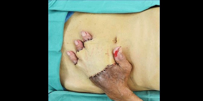 Una exitosa operación, en la que la mano se cose quirúrgicamente al interior del abdomen, le permitió recuperar al paciente gran parte de la movilidad y funcionalidad de su mano, permitiendo una durable recuperación en el dorso de la misma.