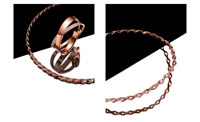Dentro de la gama de estilos Closed, X y Open, hay diseños con detalles en diamantes que brillan con un resplandor intenso. El brazalete ancho y el anillo Atlas X cuentan con pavé de diamantes engastados en un patrón de panal que maximiza la apariencia de las piedras y limita la presencia de metal entre ellas.