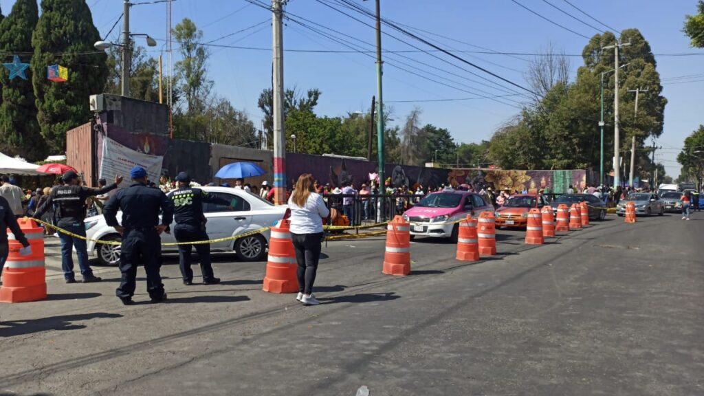 Respecto al dispositivo vial que se aplicó en los accesos de los panteones, en el caso de San Nicolás Tolentino se habilitaron dos salidas del lado poniente por calle Hidalgo y Morelos, mientras que la entrada peatonal y vehicular fue sólo por Av. San Lorenzo Tezonco, cuya vía por su configuración es estrecha desde Calz. Ermita Iztapalapa, y sólo un carril podía dar sentido al acceso para dejar continuo el segundo carril, sin embargo, la alta afluencia de visitantes con sus unidades reflejó tráfico en la zona, pero no dejó de avanzar para atender a los miles de visitantes.