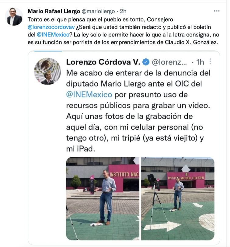 Por cierto, Mario Llergo denunció al consejero presidente del INE, Lorenzo Córdova, por, según él, utilizar recursos públicos para grabar unos spots, lo que Córdova Vianello desmintió.
