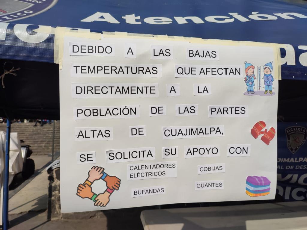 De igual forma, se habilitó a partir del este martes 27 al 30 de diciembre del 2022 y del 2 al 6 de enero del 2023, el centro de acopio en la explanada de la alcaldía, ubicada en avenida Juárez, s/n, colonia Cuajimalpa Centro, en donde se está solicitando la donación de cobijas, guantes, calcetines, calcetas y gorras en buen estado y calentadores eléctricos, en un horario de 10:00 a 19:00 horas.