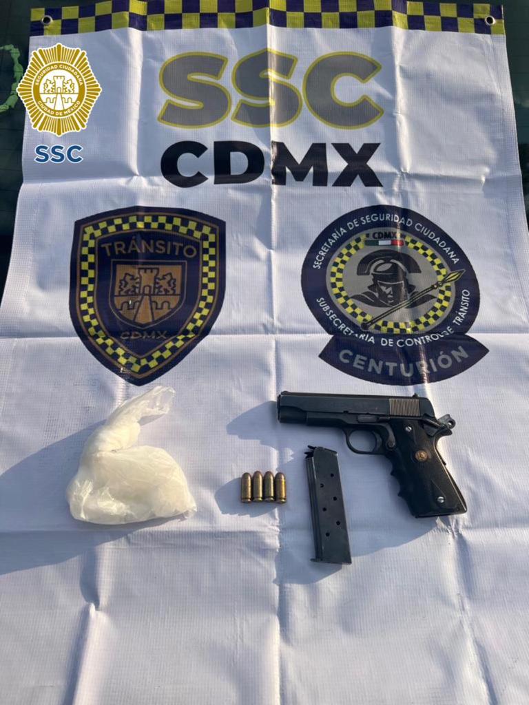 Elementos de la Subsecretaría de Control de Tránsito de la Secretaría de Seguridad Ciudadana (SSC) de la Ciudad de México detuvieron a tres personas que transportaban en el compartimento de un vehículo posible droga sintética y un arma de fuego corta, en la alcaldía Tlalpan.