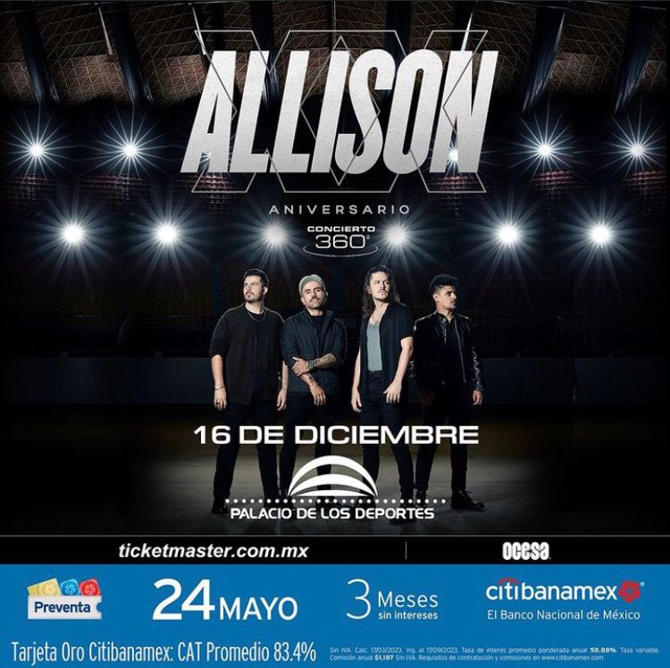 Después de girar por todo México y tocar en los lugares más emblemáticos de la Ciudad de México, Allison dará un concierto en el Palacio de los Deportes para celebrar su XX aniversario. La cita es el 16 de diciembre del presente año.
