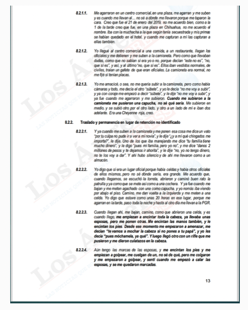 Los Ángeles Press obtuvo este documento completo, cuyo resumen digital consta de 48 páginas, 20 fotografías y dos tablas gráficas con una línea de tiempo, además de las firmas digitales de los peritos. Por su contenido con información sensible, se alude sólo al capítulo 8, referente a las “Quejas de tortura y malos tratos” así como las conclusiones, quienes exponen que los responsables de estas violaciones de derechos humanos apuntan a los agentes Iris Gabriela Santoyo Cuervo y su asistente Jean Paul Rodríguez, de la FEADLE.