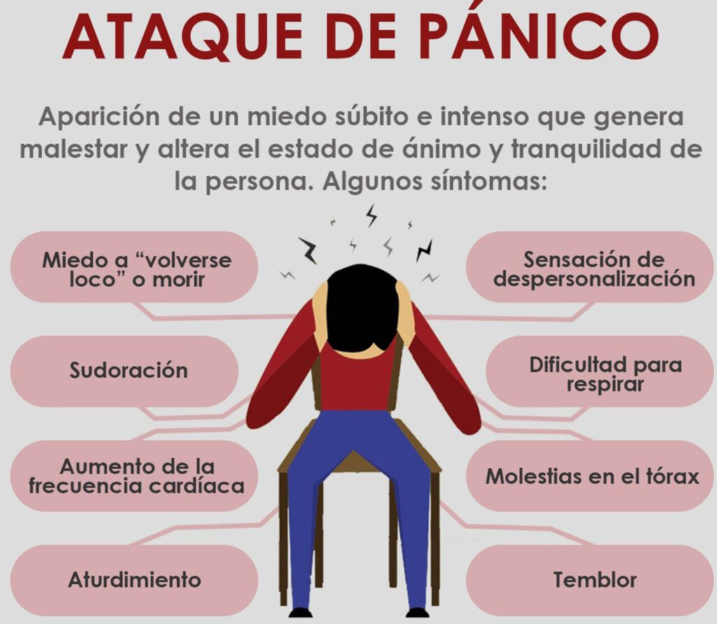 “Sensación de que los latidos del corazón se incrementan de manera importante y súbita, (taquicardia), esto se asocia con la idea de que estoy en peligro, que puedo fallecer por un ataque cardiaco; sudoración en las manos y/o sudor frío; malestar general en el pecho; sensación de ahogo, como una especie de asfixia; percepción de desesperación o pérdida de control; nausea; mareo, entre otros”, detalló.
