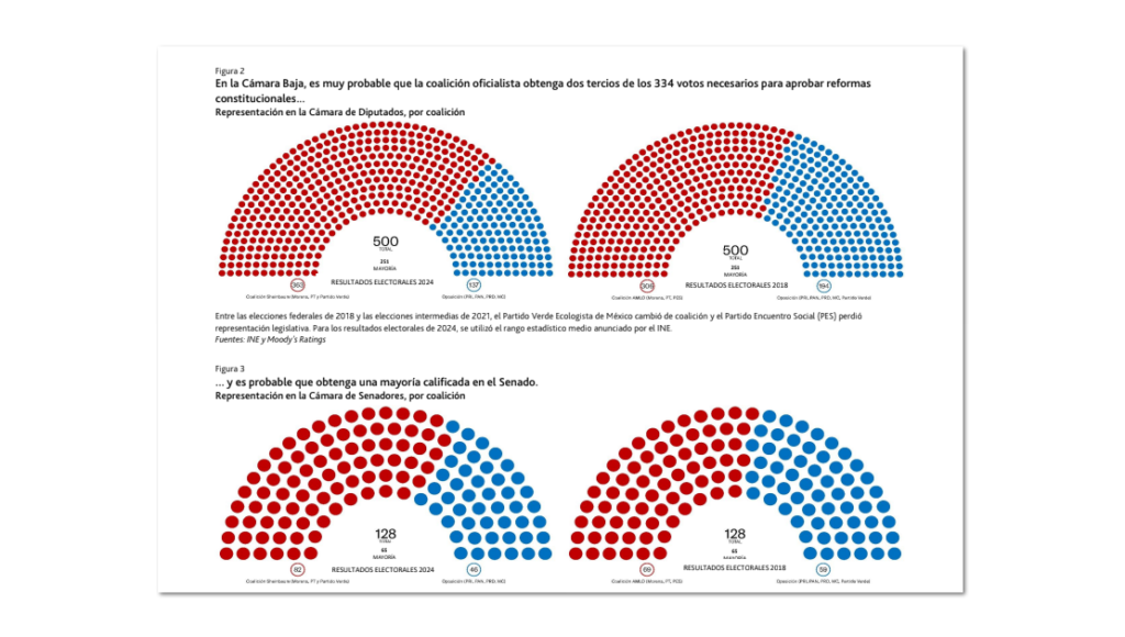 «La composición del nuevo Congreso de la Unión será favorable para Morena, ya que su coalición legislativa ganó entre el 69% y el 76% de los escaños en la Cámara de Diputados y entre el 60% y el 69% en la Cámara de Senadores. Con estos resultados, la coalición oficialista se encuentra dentro del rango para obtener una mayoría calificada de dos tercios en ambas cámaras que le permitiría aprobar reformas constitucionales (algo que AMLO no pudo lograr durante su mandato, que finalizará el 1 de octubre). La coalición de Morena también ganó seis de las ocho gobernaciones estatales y mantuvo la jefatura de gobierno de la Ciudad de México», destaca Moody’s Ratings.