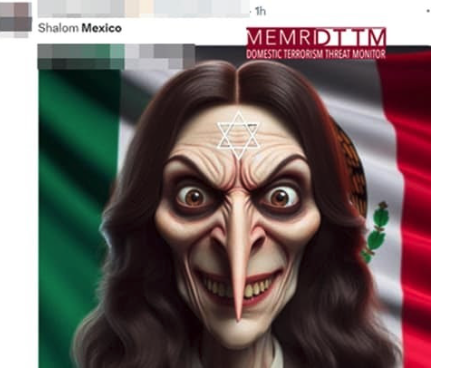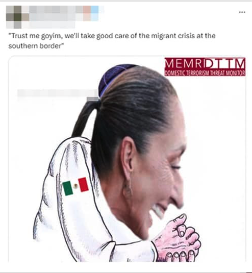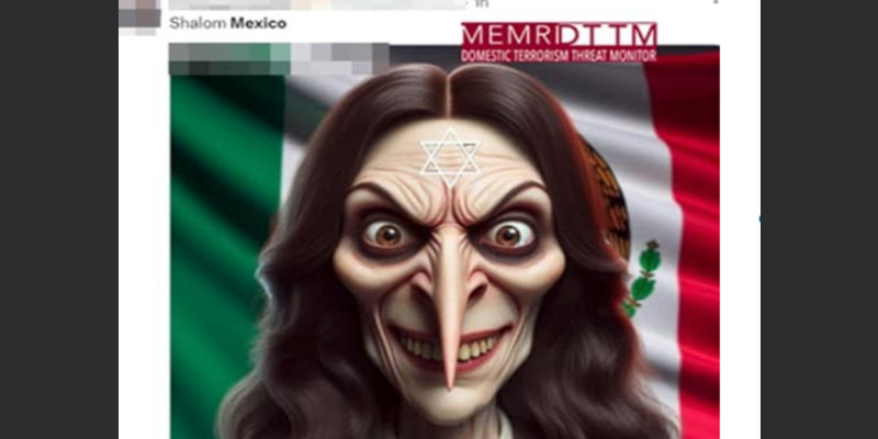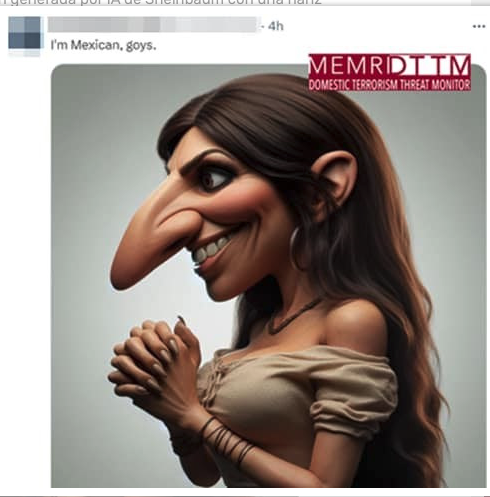 Un usuario de Neonazi X publicó una imagen retocada con Photoshop de Sheinbaum con la nariz torcida y las manos juntas, en la línea de la caricatura antisemita “El comerciante feliz”. Escribieron: “Créanme, goyim, nos ocuparemos bien de la crisis migratoria en la frontera sur.