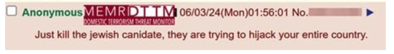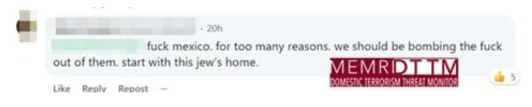 El 3 de junio, un usuario neonazi escribió: “La frontera sur de Estados Unidos está ahora completamente bajo control judío. Espere que las cosas empeoren mucho con criminales ilegales llegando a Estados Unidos, crímenes de cárteles, desaparición de blancos y niños, violaciones y asesinatos, más dificultades para los estadounidenses que entran a México, las sobredosis de fentanilo…”