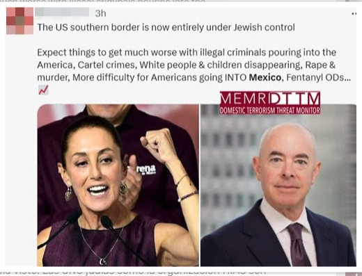 Un usuario antisemita escribió: “Las dos personas que ahora controlarán la frontera sur de Estados Unidos: el secretario del DHS, Mayorkas, y el presidente electo de México, Sheinbaum, son ambos judíos con fuertes linajes familiares vinculados al comunismo europeo. Dejemos que eso se asimile”.