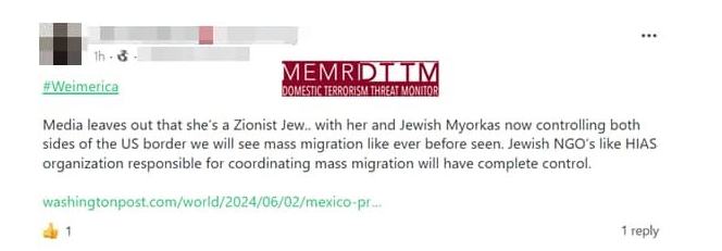 Un usuario neonazi de Gab escribió: “Los medios de comunicación omiten que ella es una judía sionista… ahora que ella y los Mayorkas judíos controlan ambos lados de la frontera de los EE. UU., veremos una migración masiva como nunca antes se había visto. Las ONG judías como la organización HIAS son responsables de coordinar la migración masiva, tendrá el control total”.
