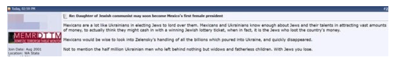 En una publicación en el foro neonazi Storm Front, un usuario hizo una comparación con el presidente ucraniano Volodymyr Zelensky. El 3 de junio, el usuario escribió: “Los mexicanos se parecen mucho a los ucranianos al elegir a judíos para que sean sus señores. Los mexicanos y los ucranianos saben lo suficiente sobre los judíos y su talento para atraer grandes cantidades de dinero, como para pensar que podrían sacar provecho de una victoria. Billete de lotería judío, cuando en realidad son los judíos quienes saquean el dinero del país. Los mexicanos harían bien en investigar el manejo que hizo Zelensky de todos los miles de millones que ingresaron a Ucrania y desaparecieron rápidamente, detrás de nada más que viudas y niños sin padre, con los judíos se pierde”.