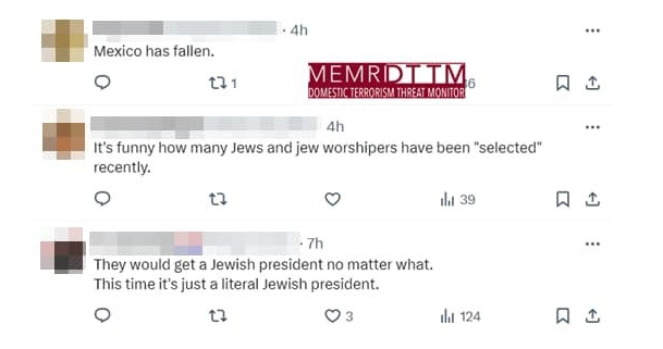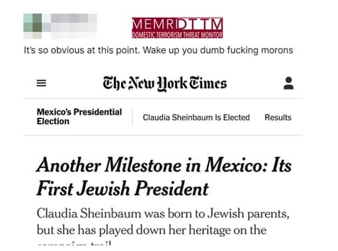 Múltiples neonazis y teóricos de la conspiración cuestionaron la posibilidad estadística de que México elija a un líder no católico, cuando los judíos constituyen un pequeño porcentaje de la población. Otros señalaron que tanto Sheinbaum como el secretario del Departamento de Seguridad Nacional, Alejandro Mayorkas, son judíos y, por lo tanto, tienen planes nefastos relacionados con la frontera sur, que implican una escalada de la inmigración ilegal. Otros afirmaron que muchos de sus rivales políticos fueron asesinados por miembros del cartel.