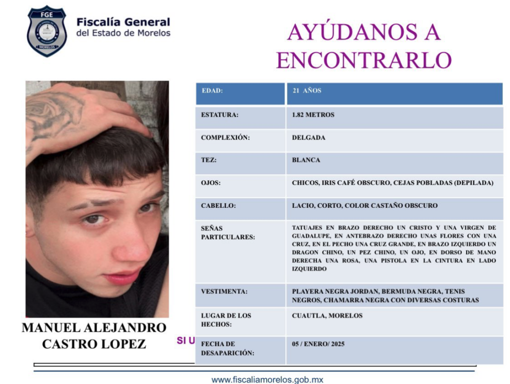 La Fiscalía General de Justicia del Estado de Morelos emitió una cédula de búsqueda para localizar a Manuel Alejandro Castro López, de 21 años, desaparecido este 5 de enero en Cuautla, Morelos.