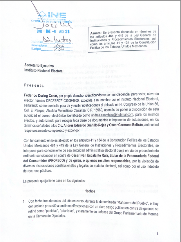 El panista recordó que el pasado 3 de enero, durante una “Mañanera”, Escalante emitió manifestaciones con un claro sesgo político en contra de quienes se refirió como “panistas”, “prianistas”, y claramente en defensa del Grupo Parlamentario de Morena en la Cámara de Diputados.