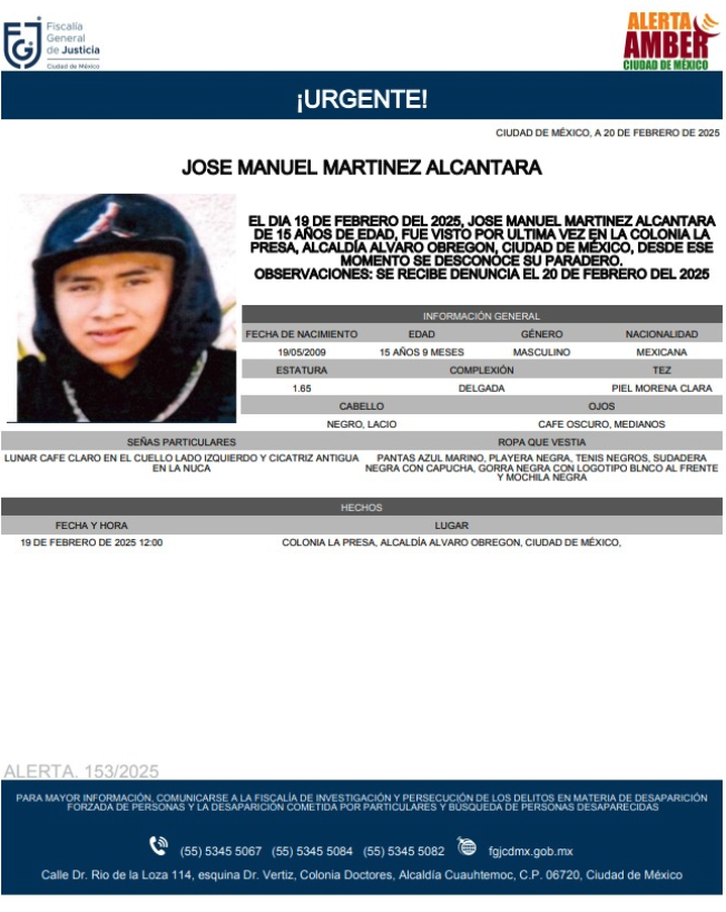 José Manuel Martínez Alcántara, de 15 años, desapareció el 19 de febrero en la colonia La Presa, de la alcaldía Álvaro Obregón, en la Ciudad de México.