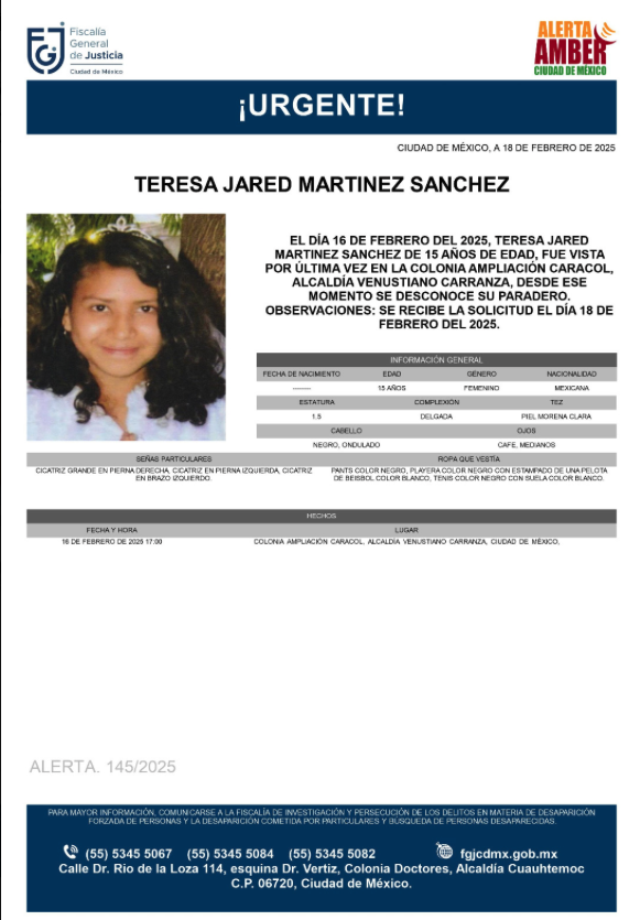 Teresa Jared Martínez Sánchez, de 15 años, desapareció el 16 de febrero en la colonia Ampliación Caracol de la alcaldía Venustiano Carranza, en la Ciudad de México.
