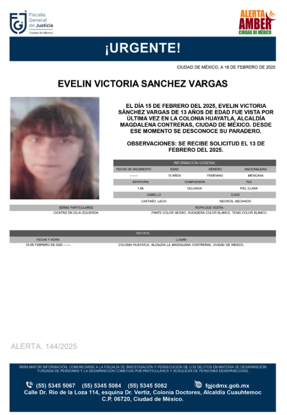 Evelin Victoria Sánchez Vargas, de 13 años, desapareció el 15 de febrero 2025, en la colonia Huayatla, de la alcaldía Magdalena Contreras, de la Ciudad de México.