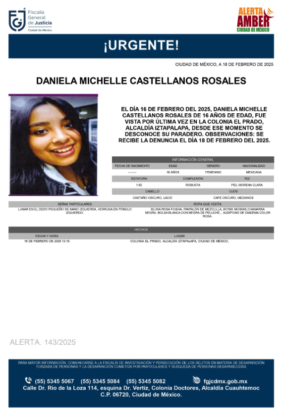 Daniela Michelle Castellanos Rosales, de 16 años, desapareció el 16 de febrero en la colonia El Prado de la alcaldía Iztapalapa, en la Ciudad de México.
