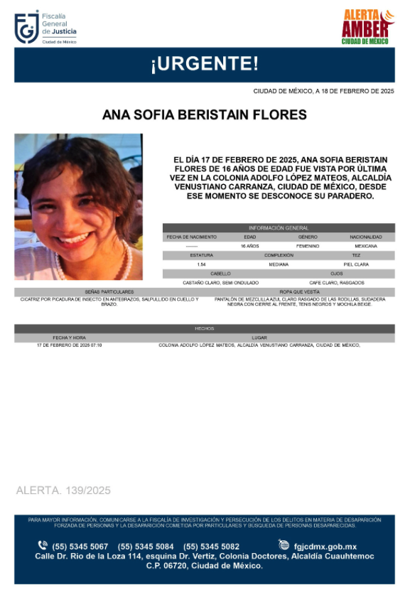 Ana Sofía Beristain Flores, de 16 años, desapareció este 17 de febrero en la colonia Adolfo López Mateos, de la alcaldía Venustiano Carranza, Ciudad de México.