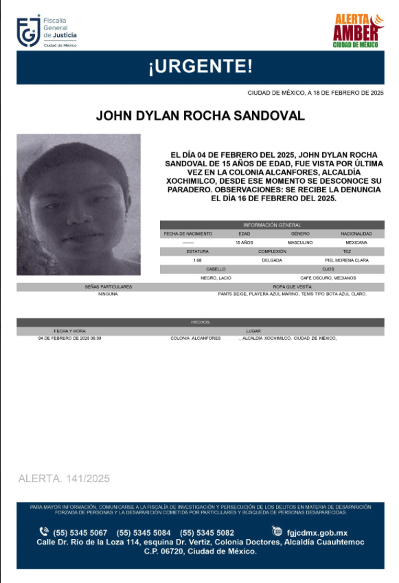 John Dylan Rocha Sandoval, de 15 años, desapareció el 4 de febrero 2025, en la colonia Alcanfores de la alcaldía Xochimilco, en la Ciudad de México.