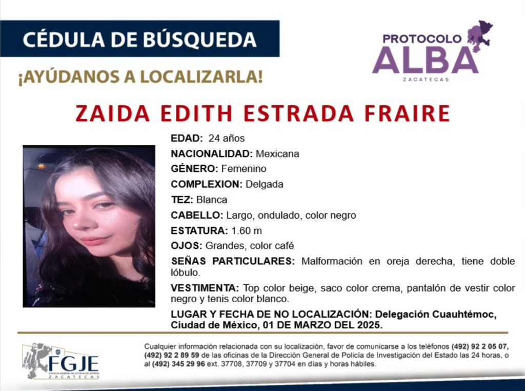 Zaida Edith Estrada Fraire, de 24 años, viajó de Zacatecas a la Ciudad de México para asistir al Senado de la República a un Parlamento Juvenil y después ya no se supo nada de ella. Desapareció el 1 de marzo en la alcaldía Cuauhtémoc, de la Ciudad de México.