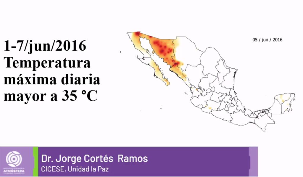 El investigador se refirió a la onda de calor ocurrida entre el 1 y el 7 de junio de 2016, cuando se observó cómo la temperatura subió en algunas zonas del país con una máxima diaria superior a 35 grados; el fenómeno sucedió en especial en el noroeste y, sobre todo, en el centro de Sonora.