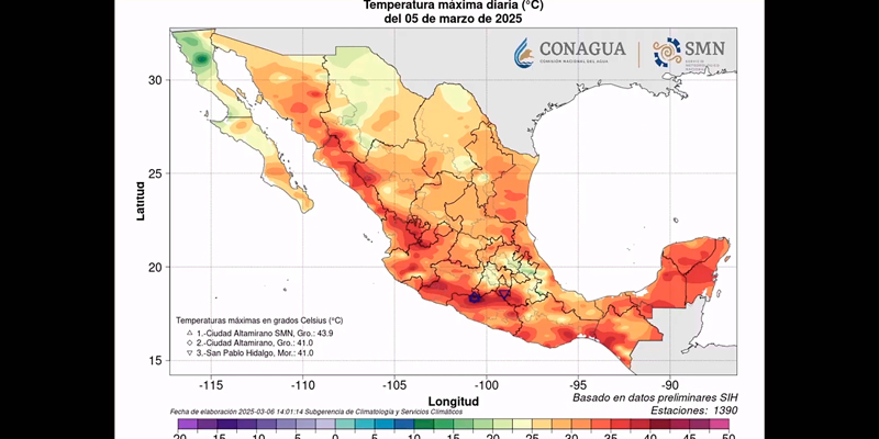 En una imagen del 2 de marzo pasado se comenzaban a ver por arriba de 40 grados en algunos sitios del país, pero al menos en el centro del territorio nacional no se están rebasando las normales climatológicas (o promedios de temperatura máxima), aclaró el experto.