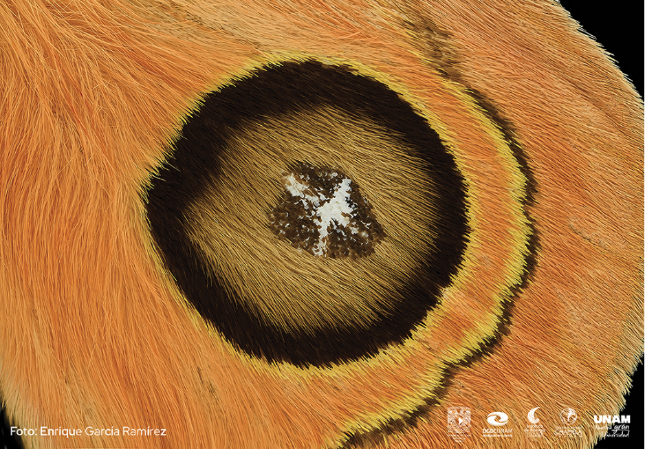 Polilla ojo de venado (Automeris), detalle a 2X de aumento, 2023.