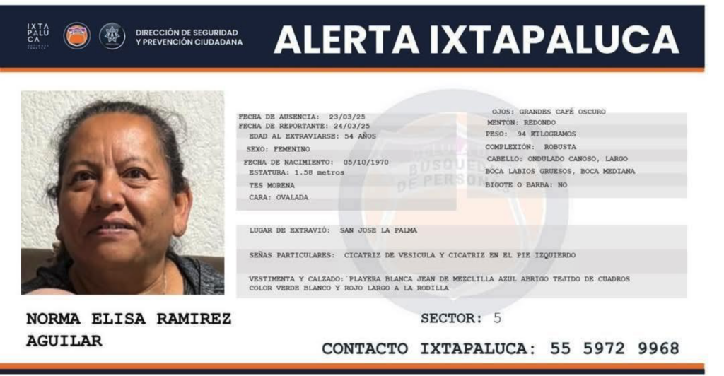 La Dirección de Seguridad y Prevención Ciudadana de Ixtapaluca, emitió una cédula de búsqueda para Norma Elisa Ramírez Aguilar, de 54 años, quien desapareció este domingo 23 de marzo de 2025, en San José La Palma, Estado de México.