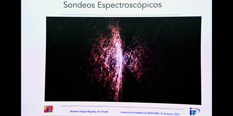 En el evento, la directora del IF, Mercedes Rodríguez Villafuerte, recordó que en junio de 2023 se reunieron en esta entidad académica para liberar los primeros datos de DESI, un telescopio que crea un mapa tridimensional del cosmos.