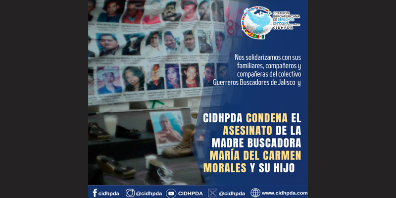 El Consejo Nacional de la Comisión Iberoamericana de Derechos Humanos para el Desarrollo de las Américas (CIDHPDA) condenó el asesinato de María del Carmen Morales, integrante del colectivo Guerreros Buscadores de Jalisco, y su hijo Jaime Daniel Ramírez Morales, ocurrido la noche del miércoles 23 de abril en el municipio de Tlajomulco de Zúñiga, Jalisco.