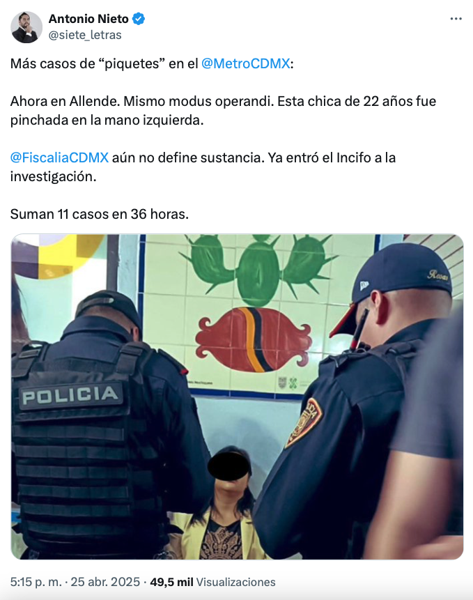 De acuerdo con información del periodista Antonio Nieto @siete_letras, este 25 de abril en la estación Allende de la Línea 2 del Metro, una joven de 22 años fue pinchada en la mano izquierda.