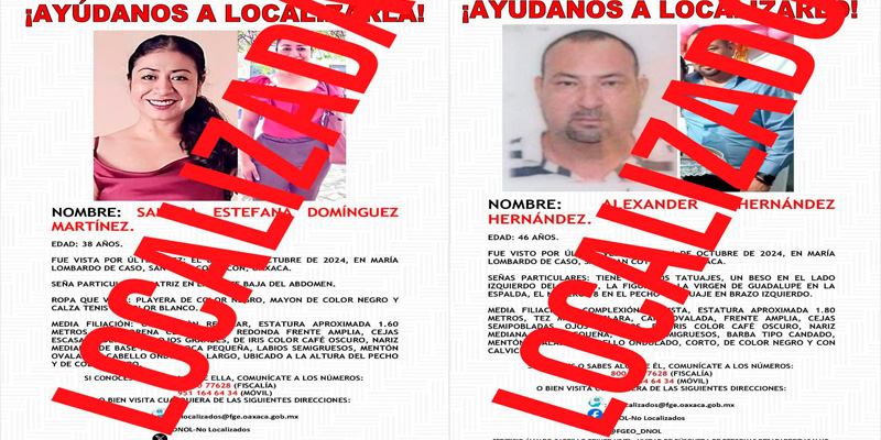 Como resultado de los trabajos de inteligencia criminal que lleva a cabo la Fiscalía General del Estado de Oaxaca (FGEO), en coordinación con diferentes instituciones estatales y federales, fue posible la localización sin vida de la activista Sandra Estefana Domínguez Martínez y de su esposo Alexander Hernández Hernández, reportados como desaparecidos el 8 de octubre de 2024, informó el fiscal Bernardo Rodríguez Alamilla.