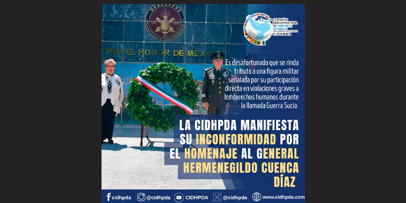 El Consejo Nacional de la Comisión Iberoamericana de Derechos Humanos para el Desarrollo de las Américas (CIDHPDA) manifiesta su total rechazo al homenaje organizado por la Secretaría de la Defensa Nacional el pasado 12 de mayo, en el que se depositaron los restos del general Hermenegildo Cuenca Díaz en el Panteón Dolores de la Ciudad de México.