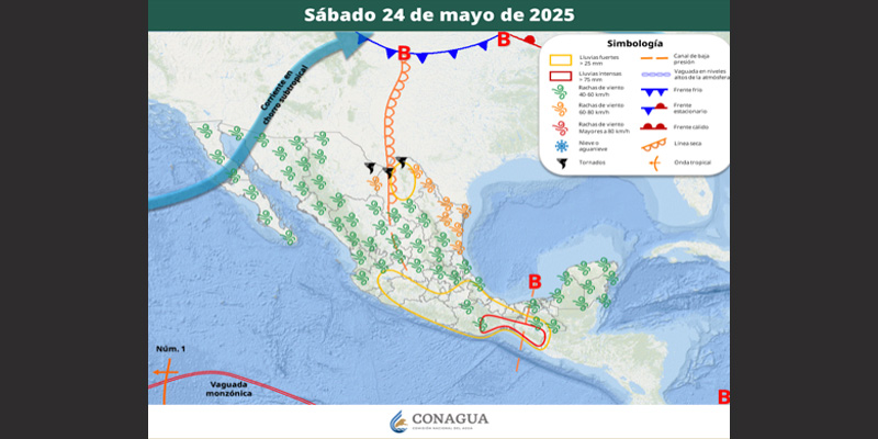 intensas (de 75 a 150 milímetros [mm]) en Oaxaca y Chiapas; muy fuertes (de 50 a 75 mm) en Michoacán y Guerrero; fuertes (de 25 a 50 mm) en Jalisco, Colima, Estado de México, Ciudad de México, Morelos, Puebla, Tlaxcala, Hidalgo y el sur de Veracruz, y chubascos (de 5 a 25 mm) en Tabasco, Campeche, Yucatán y Quintana Roo. A su vez, una línea seca en el norte del país, inestabilidad atmosférica y un canal de baja presión en las mesas del Norte y Central, generarán chubascos en Chihuahua, Durango,