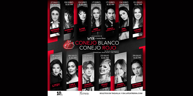 Late producciones y Aurora Nova, anunciaron una nueva temporada de la aclamada obra de teatro “Conejo Blanco, Conejo Rojo”. Esta puesta en escena escrita por el dramaturgo iraní Nassim Soleimanpour se presentará todos los martes, a partir del 27 de mayo hasta el 29 de julio en la Sala A de la Teatrería.